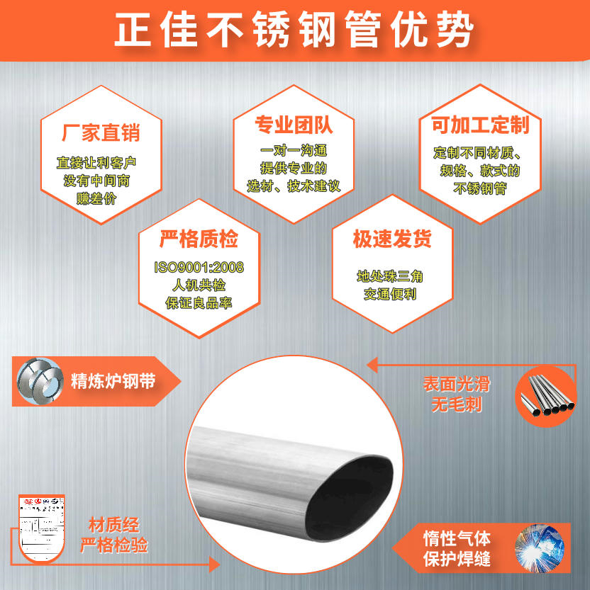 佛山正佳不銹鋼裝飾管廠家,專業(yè)定制316l不銹鋼橢圓管、316不銹鋼橢圓管、304不銹鋼橢圓管和各種材質(zhì)的不銹鋼平橢管;適用于樓梯扶手、圍欄、市政護(hù)欄等各種建筑裝飾場合中;規(guī)格齊全、材質(zhì)多樣,20年實(shí)力大廠直銷,值得信賴!
